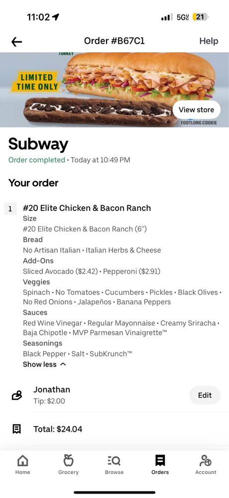 Two greats meet: Doritos® joins Subway® with a layer of delicious Doritos® Nacho Cheese Flavored Tortilla Chips and rotisserie-style chicken smothered in our cheddar cheese sauce and Monterey Cheddar cheese, then topped with jalapeños, juicy tomatoes and crisp red onions. A drizzle of Baja Chipotle sauce caps off this bold nacho experience that's perfect to pair with any meal. Add avocado for an additional charge.